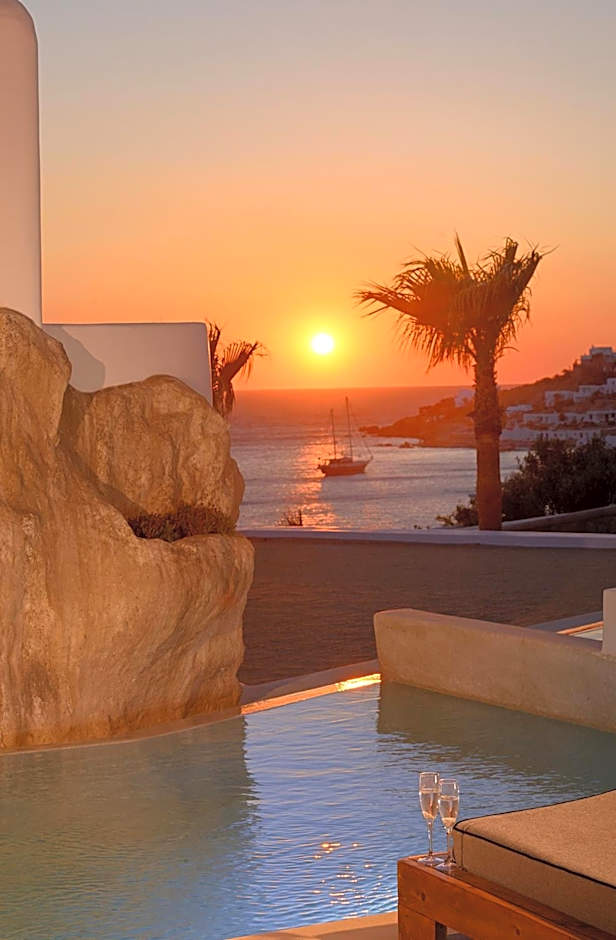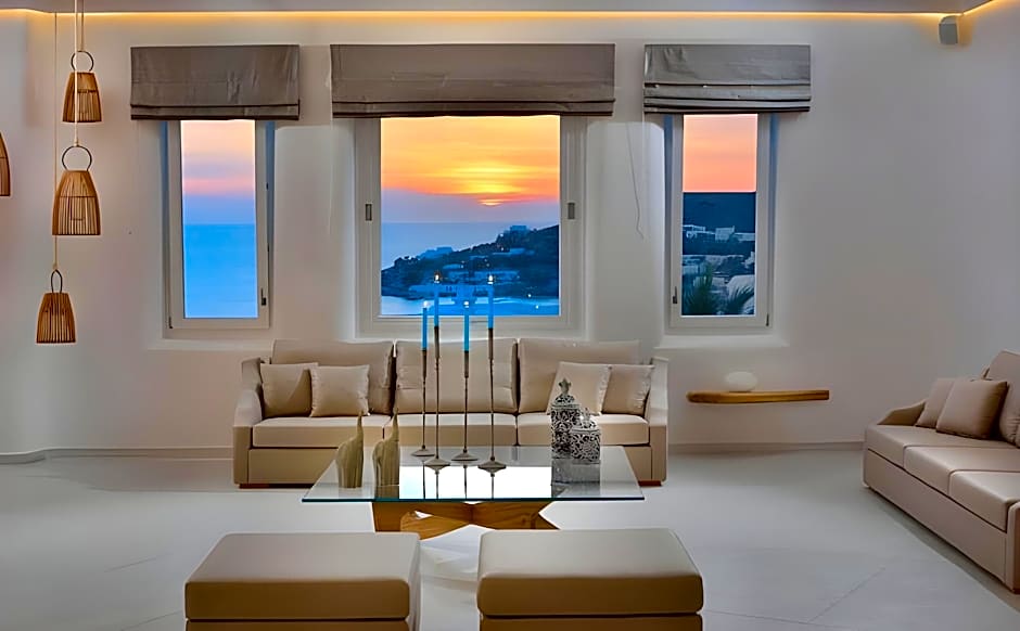 Trå inn i en solfylt ferieperle ved vannkanten på Mykonos, hvor et sesongåpent utendørs saltvannsbasseng fungerer som et infinitybasseng med en vidtstrakt utsikt. Et privat strandområde (gratis) venter rett ved sandkanten, og stedet ligger omtrent [avstand ikke oppgitt] fra bysentrum for enkel utforskning av øya.